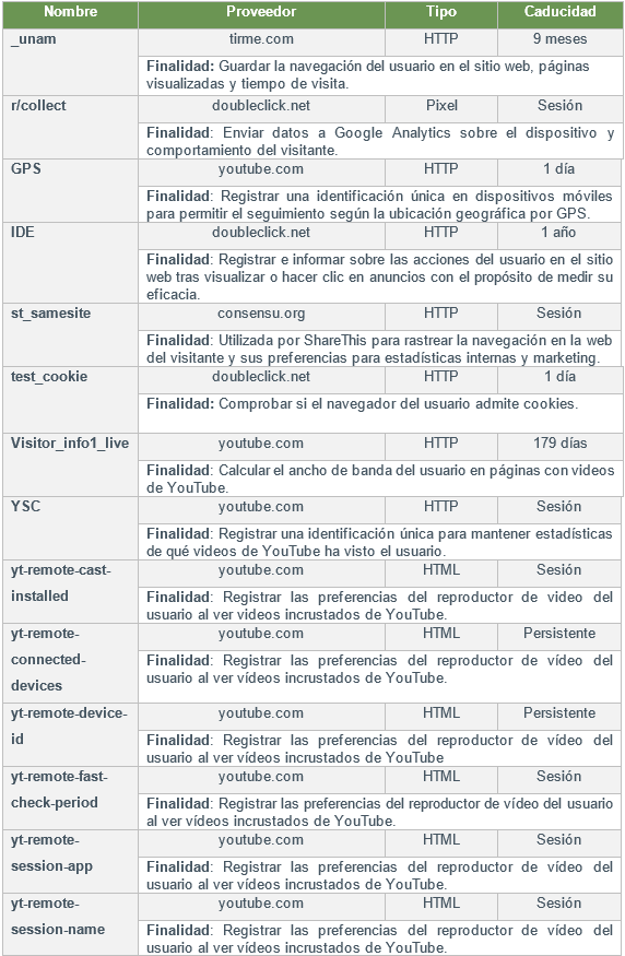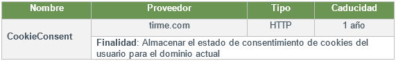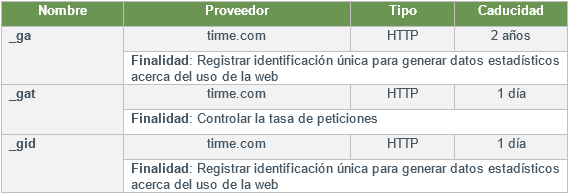 TIRME us informa de les galetes següents que s'empren en aquest Lloc web, classificades segons la seva finalitat: