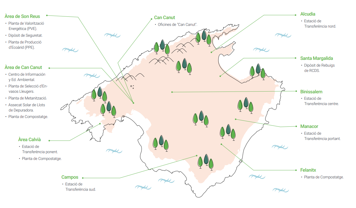 Planta de Valorització Energètica Dipòsit de Seguretat Planta de producció d'Ecoàrids Oficines de Can Canut Centre d'Informació i Educació Ambiental Planta de selecció d'Envasos lleugers Planta de metanització Assecat Solar de fangs de depuradora Planta de Compostatge Estació de Transferència Ponent Planta de compostatge Estació de Transferència Nord Dipòsit de rebuigs de RCDS Estació de Transferència Centre Estació de Transferència Llevant Planta de compostatge Estació de Transferència Sud